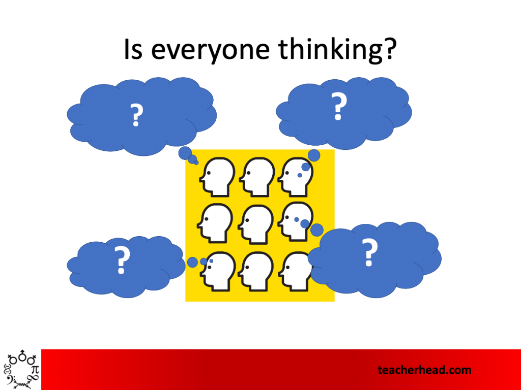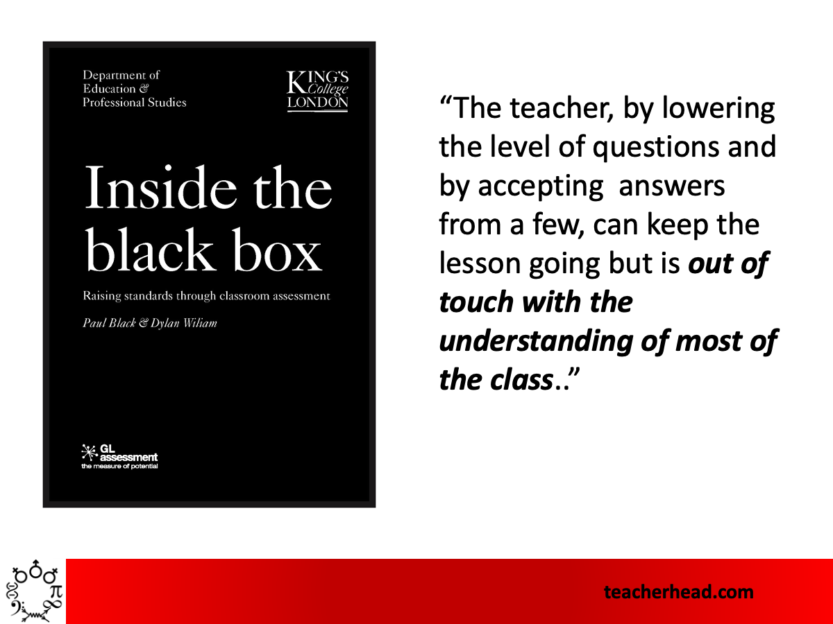 Dylan Wiliam and Paul Black has this great insight in their classic work Inside the Black Box. When teachers only select students who volunteer and are worried about getting through the material, they tend to ask less demanding questions in order to keep going forwards: