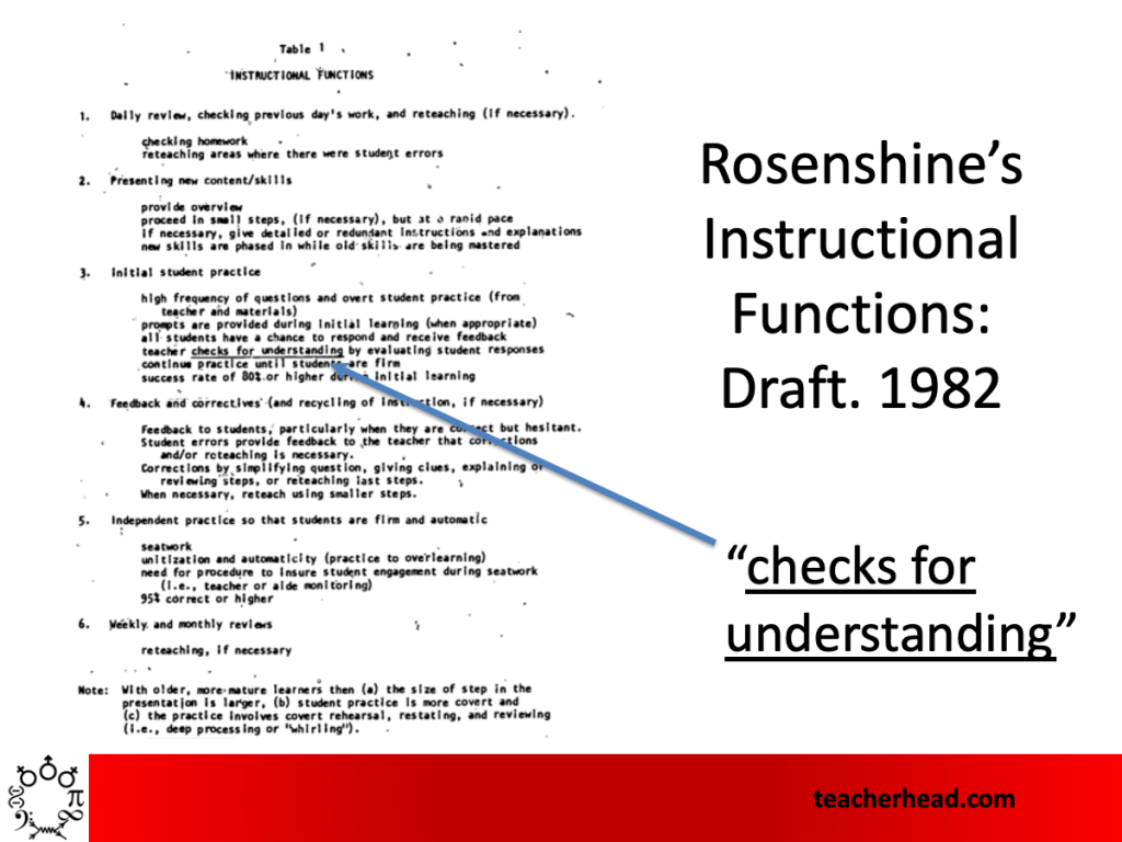 That’s a significant challenge to teachers. Are you making the decision to move on whilst being ‘out of touch with the understanding of most of the class?’ It’s so important to be responsive, ready to move back as well as forward if needed. Rosenshine has a useful set of guidance, comparing more and less effective teachers, stressing the dual purpose of checking students’ learning.