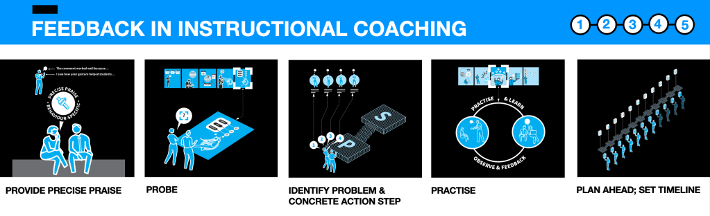 Novices and experts: You definitely need to flex the approach according to each teacher’s experience and capacity for self-directed improvement. You get to know how a teacher responds to feedback over time in the process – it might not be immediately obvious. Part of the learning process for coaches is knowing when to let the teacher lead the whole discussion, probing in a sparing way – and when to be more direct, giving more firm guidance and stronger direction on what is likely to work. It takes time to find the right tone and groove with any individual.