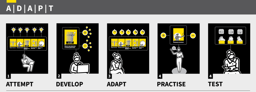 ADAPT: Even though we might have a source of defined strategies and action steps, it’s so important to make them work in a context: specific classes of students; specific teaching resources; specific assessment modes. Developing a technique by adding more fine-grained steps or adapting more fundamentally – changing things around a bit – is essential. It has to feel like a teacher’s own strategy, not one they are implementing on someone else’s terms.