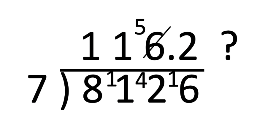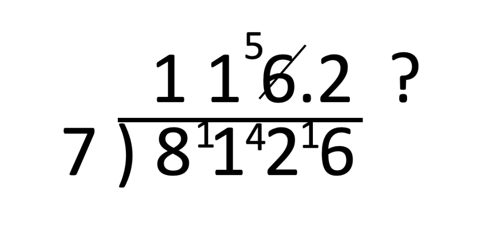 I asked him if he was sure.. could 8126 divided by 7 be 115.2? He couldn’t see an immediate issue. He wasn’t thinking that the answer should be 1000 and something; we wasn’t troubled by the answer only being in the 100s. Fundamentally he wasn’t thinking about the scale of each number and what a concrete version of his problem looked like. He wasn’t connecting digits to place value ie the 8 means 8000. It was all blind procedure. But, in prompting him, he was troubled by the 0.2 because he’d been told to find a remainder. What had he done? He’d correctly applied the method as far as 7s into 42 goes 6. But then Karim was left with that last 6. Here he became confused with subtraction… so he ‘borrowed’ 1 from the top line 6 to make 16… then added a decimal point because, with some logic, he thought 6 divided by 7 is less than one. All a bit of a mess – but so close. Karim is also 17.