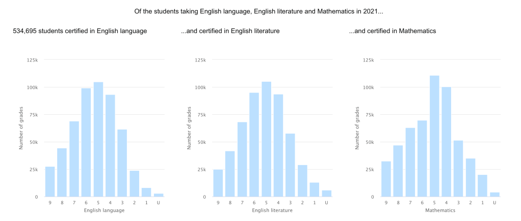 As these Ofqual charts illustrate, the familiar distribution is ever-present. If you look into each subject’s data in detail – following the link – you find that over 170,000 students in each cohort are getting grades 1-3 in English and Maths. That’s about 30% of each cohort.