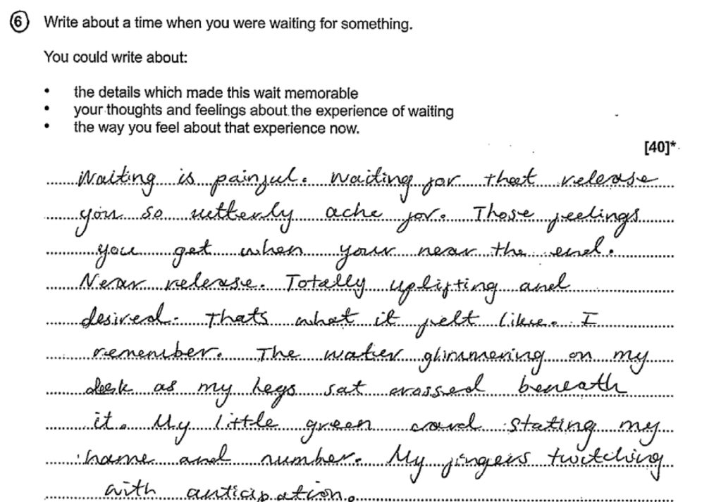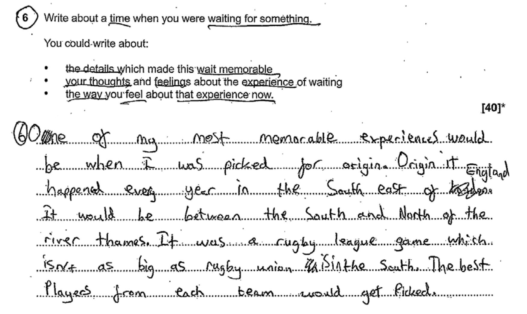 This is just the first paragraph; the candidate got 17/40 for this longer-answer question and a total between 50 and 67 out 160 for the whole exam. That’s a grade 3. The link leads to a discussion of a range of samples. You can see in the sample above that the student, aged 16, can communicate to a degree – it’s not without merit but it’s far from anything sophisticated. For contrast, here’s a candidate that got Grade 5 overall, with 25/40 on this same question: