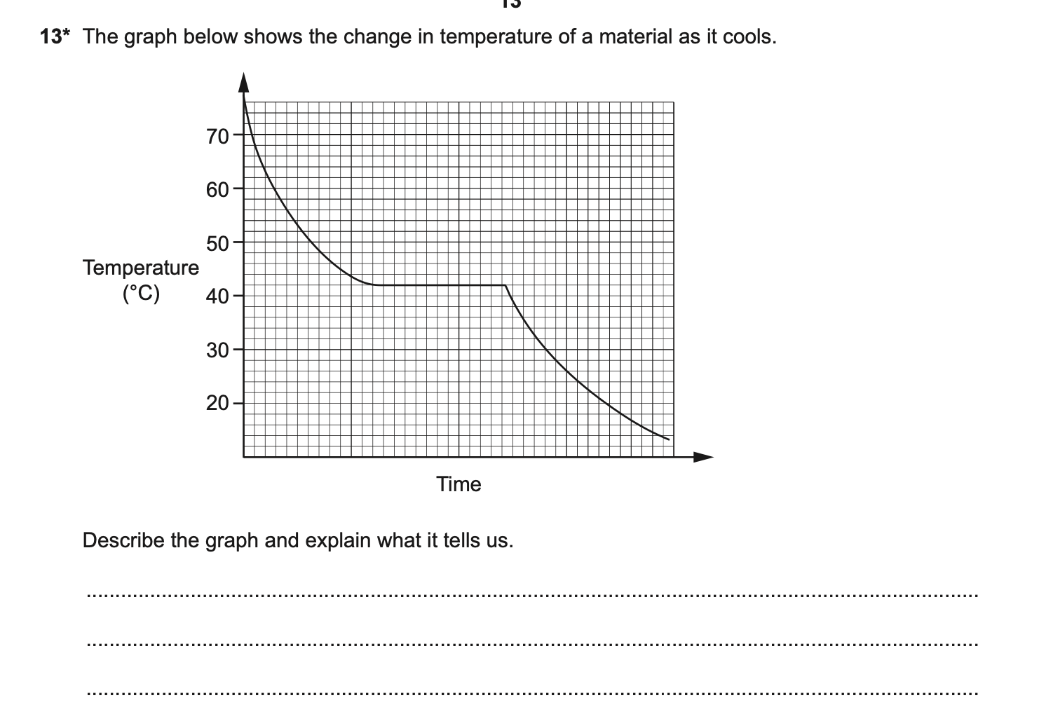 This was targeted up to Grade 5. The question proved challenging to most candidates, with very few making clear, detailed judgements about what the graph showed. Most responses achieved Level 1 as they only gave a simple description of what was happening to the temperature during the 3 main sections of the graph. The more able candidates were able to link the constant temperature section of the graph with a change of state taking place for Level 2. A more complete response for Level 3 would also have included either a description of how the rate of temperature decrease varied throughout the graph or a conclusion about the properties of the material.