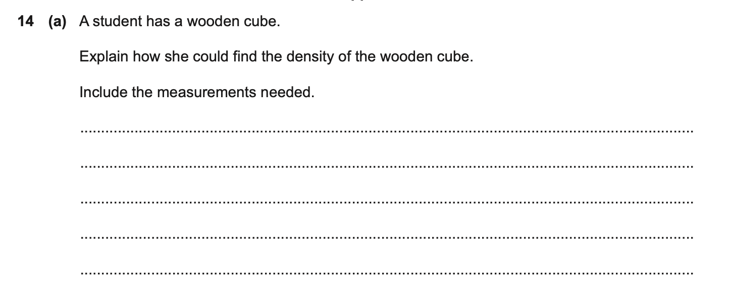 The examiner’s report says: Most candidates attempted this question but a significant proportion did not gain any credit. The question required candidates to identify the measurements required and recall the equation: density = mass / volume. Some candidates gained credit for identifying a measurement or stating the equation but only the higher ability candidates gained full credit.