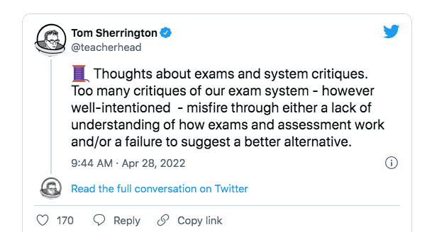 Thoughts about exams and system critiques. Too many critiques of our exam system – however well-intentioned – misfire through either a lack of understanding of how exams and assessment work and/or a failure to suggest a better alternative.