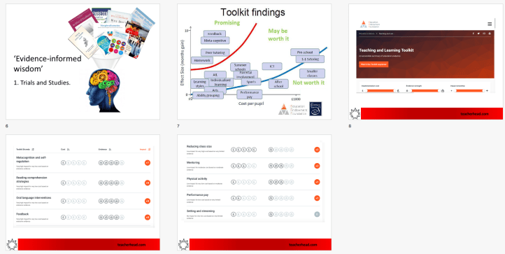 Being evidence-informed is important – but there are two ways of thinking of this. The first is ‘Trials and Studies’. This approach is taken by the EEF and other bodies; studies into specific areas of activity are undertaken and measures of impact are made – alongside costs and other factors.