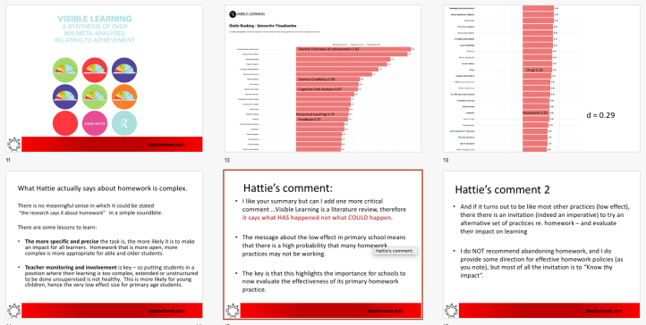 This approach informed Hattie’s famous Visible Learning work that dominated discourse in the early 2010s -until people challenged the whole notion of ‘effect size’. If you can put ‘Drugs’ on a list of inputs -immediately we need to know which drugs, in which doses, for what purpose, with which students etc.. (It’s about ADHD). But the same must also apply to ‘Homework’ – all the variables need exploration. I explored this in detail in a 2012 blog which Hattie commented on. He’s clear that his research only shows what has happened, not what could happen.. such an important distinction. There is no absolute truth about homework’s effectiveness without detailed context.