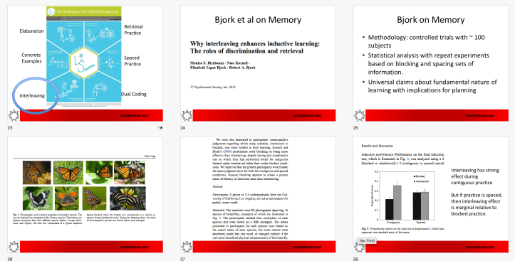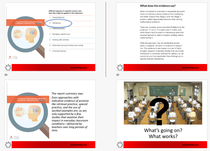 Interleaving is one of the approaches covered in the EEF review of practices based on applying cognitive science. The report suggests that, to-date, there are just not enough trials of this kind – where eg interleaving or spaced practice or retrieval practice – are tested in ‘everyday classroom conditions – delivered by teachers over long periods of time’. So, for some, an ‘insufficient evidence’ cloud hangs over these ideas.