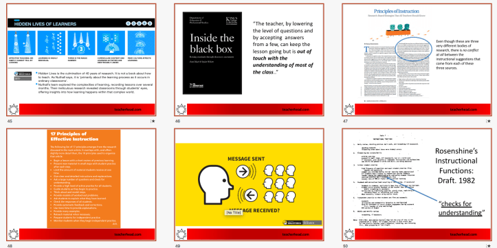 Wiliam and Black’s work in Inside the Black Box and Rosenshine’s Principle of Instruction show how general ideas about learning manifest themselves in classrooms. They explore what teachers actually do when they seem to be successful and explain this in terms of the underpinning learning process. Their insights gain acceptance because they chime with teachers’ reality and because they can be explained.