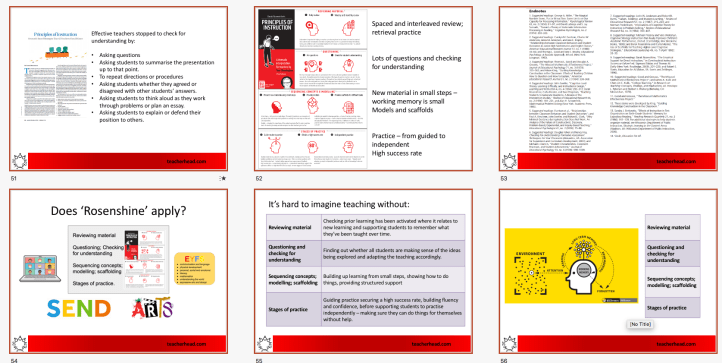 For me, the ‘evidence informed’ label doesn’t apply to Rosenshine because he proved that his ideas are backed up in any particular studies. I for one have never gone through each of his citations to see his references and suggested readings. I don’t feel I need to. I don’t expect anyone to have tested ‘daily review’ or ‘modelling and scaffolding’ in the specific contexts I inhabit. I have confidence in the ideas because they are rooted in a model of learning that seems secure and can be applied in multiple contexts. We can explain each of the 10 principles (or 17 in their original form) in terms of the model of learning that has been reinforced by numerous cognitive scientists. It makes total sense to me. It’s the whole field of study that provides the evidence; this is what gives us confidence – not some measured effect sizes in a few context-specific trials.