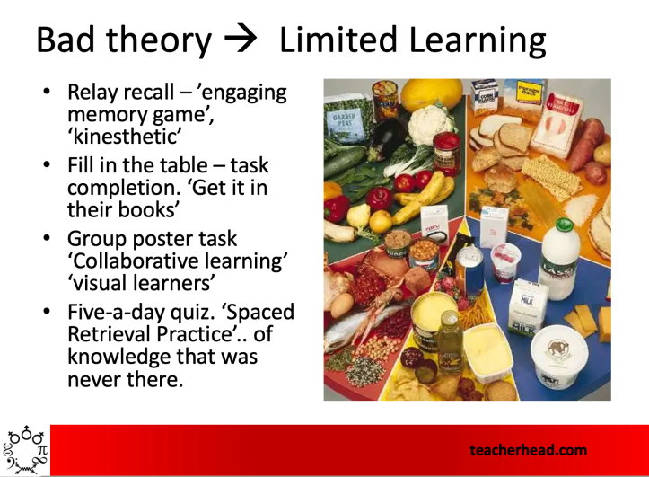 Does it matter if teachers have a secure model for a learning process? Yes it does. Otherwise they end up doing things that are ineffective – I have seen many examples of poor lesson activities that stemmed from the teacher’s dodgy model for learning. This includes retrieval routines that somehow replaced the actual teaching bit.
