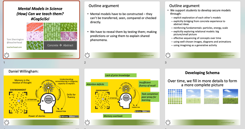 This week I had the honour of giving a keynote at the excellent #CogSciSci event hosted at Landau Forte Academy Sixth Form in Tamworth. In a rather over-full talk (sorry!) I set out to explore a range of ideas about mental models in science and how we need to be deliberate and thoughtful in how we support students to develop them.