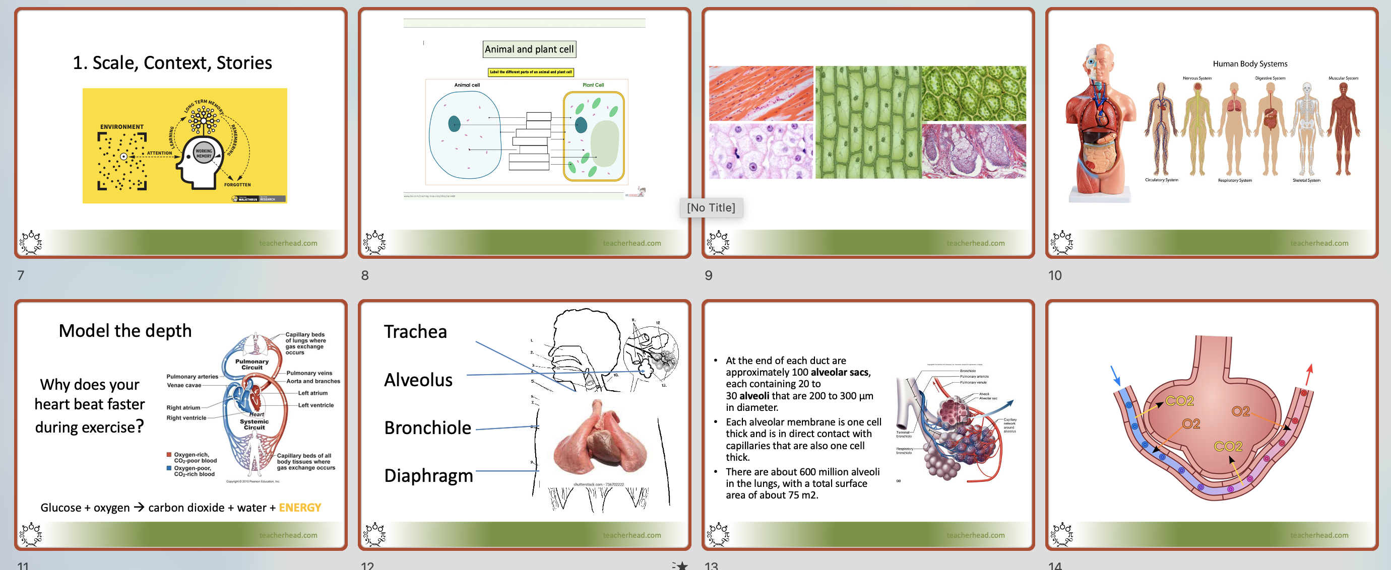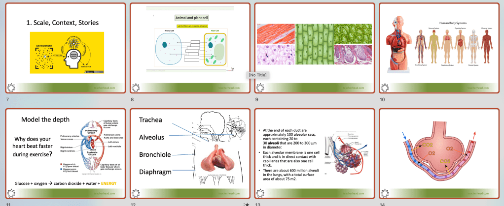 Here I argued that cells, for example, can seem weirdly abstract and disconnected from their context if introduced with the classic animal-plant comparison worksheet – rather than via some images of real cells in the context of tissues and organ systems. Then, with the respiratory system, there’s a story students should be able to tell – at a depth appropriate for their age/stage. The sheep’s lung demo (which I LOVE) has to support the form a model for the millions of alveoli acting as sites of gas exchange.. it’s not just showing some offal on a slab, then getting a labelled diagram stuck in your book. The explanatory story has to connect macro to micro and vice versa.