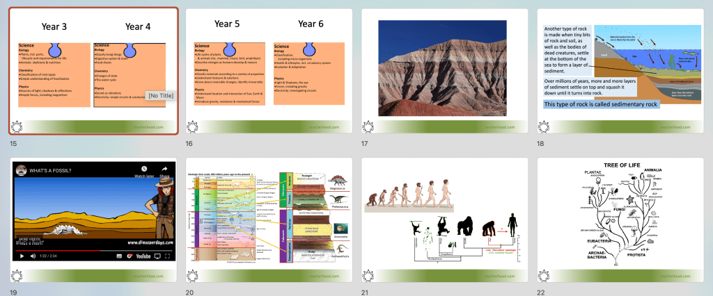 A second example was the story that lies like a brilliant easter egg in the National Curriculum for KS2, linking Rocks to Evolution via the concept of the age of the Earth, the scale of time, the fossil record, the dinosaur evolution and extinction story and the glorious tree of life with the embedded notion of common ancestry. We did not evolve from chimps; but we have common ancestors. And whales and hippos are more closely related to each other than to anything else. If you know the story, you can tell it. It links ideas up; it helps build a mental model for the scale of time that is needed for evolution to make sense.. through the slow change processes that are revealed through rocks. (This is why science is the best!)