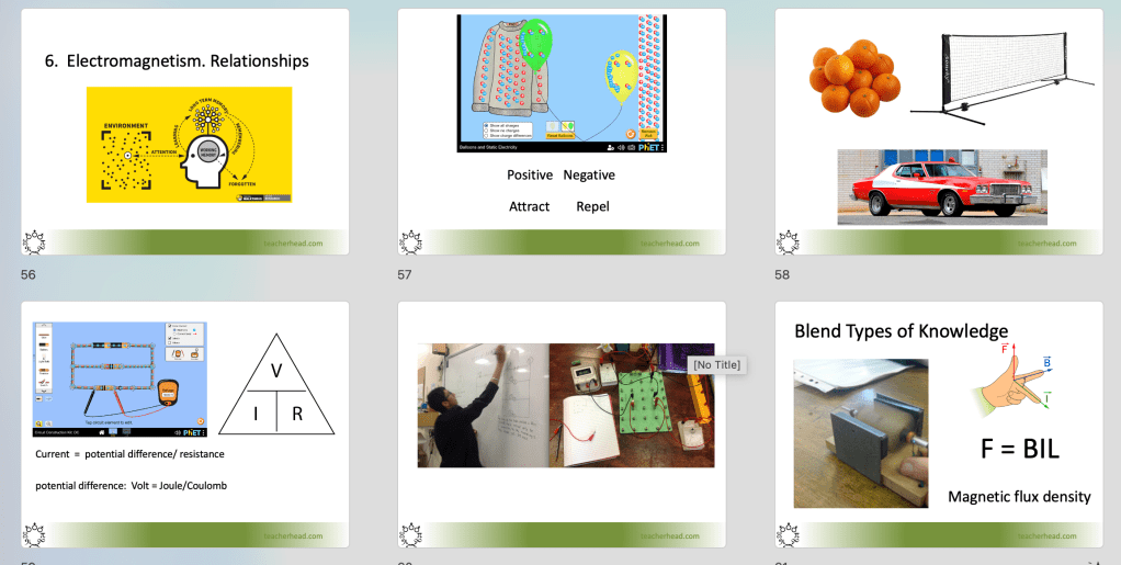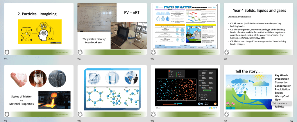 Here, I talked about the central idea of particles in explaining phenomena. For students to understand states of matter, diffusion and numerous other issues, they need to be able to imagine the particle behaviours. That can be done explicitly – as I explored via an account of a Y5 lesson I’ve seen where the teacher did this brilliantly; each child imagining water molecules in their beaker of water; in their ice cube; in their freshly made condensation. I also touched on the power of PHET animations and the issue of separating states of matter from inherent material properties ie water can be a liquid, solid or gas – but so can iron and oxygen, if the conditions are right.