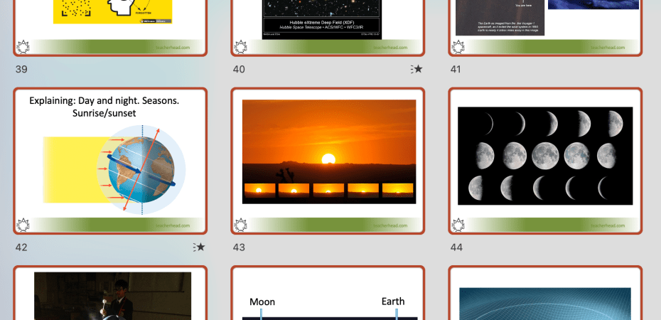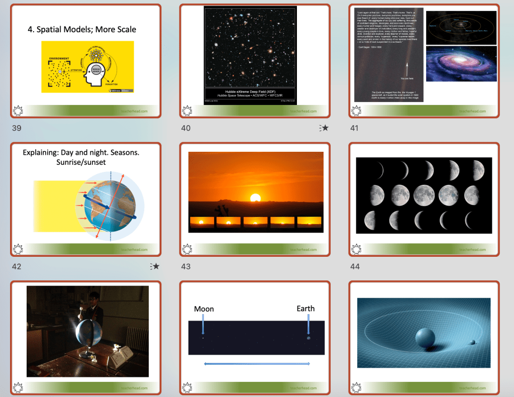 Here I was looking at a range of space-related phenomena to illustrate how important it is to support students in forming sound spatial models for objects in order to understand the scale and orientation of cosmic objects. The diagrams and images we use play a vital role. There’s a fabulous story around the Earth as a supremely isolated planet in the vastness of space – bring on Carl Sagan and the Hubble Ultra Deep Field. Then, every-day phenomena like day/night and sunsets need students to have opportunities to create mental images of a rotating planet at a distance from the sun. (You can’t take them to see a sunset and demonstrate that it takes exactly two minutes to drop over the horizon – but you can create the impression with images and a story). Moon phases need a good 3-D orientation and sense of scale to properly understand and here, you can get the class to track the moon with their own eyes. For A level students looking at gravity, a good 3-D field model helps explain all kinds of phenomena such as satellite orbits.