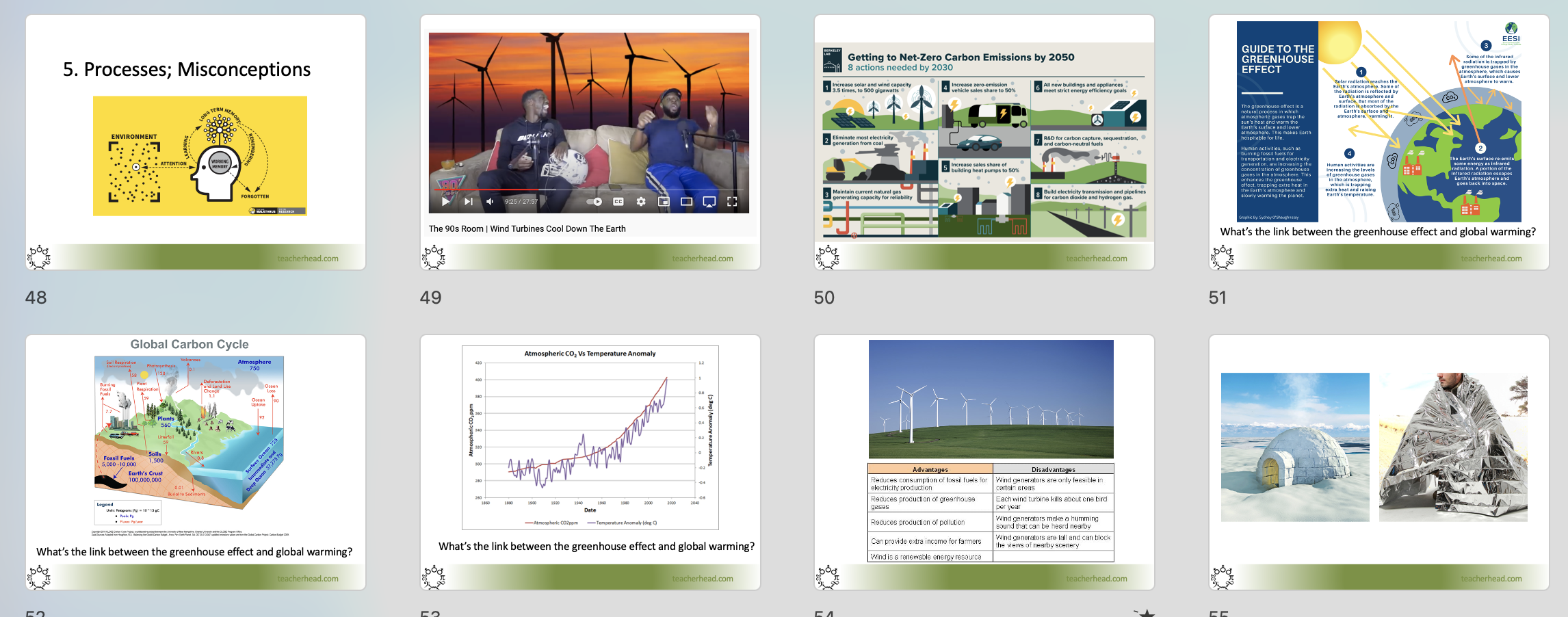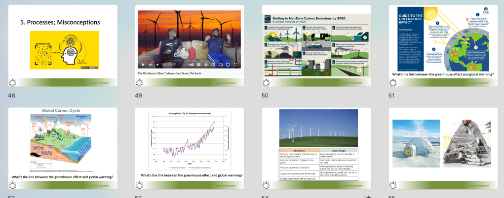 Here I used the example of global warming and climate change via the function of wind turbines, inspired by a hilarious YouTube video where some young men discover that one of their friends had thought wind turbines were designed to cool down the Earth – like giant fans – rather than being a renewable means of generating electricity. If we want students to understand the concept ‘net zero’, a whole range of processes need to be explored and connected: greenhouse effect, temperature equilibrium in balance with the carbon cycle, now disrupted by fossil fuel combustion and so on…