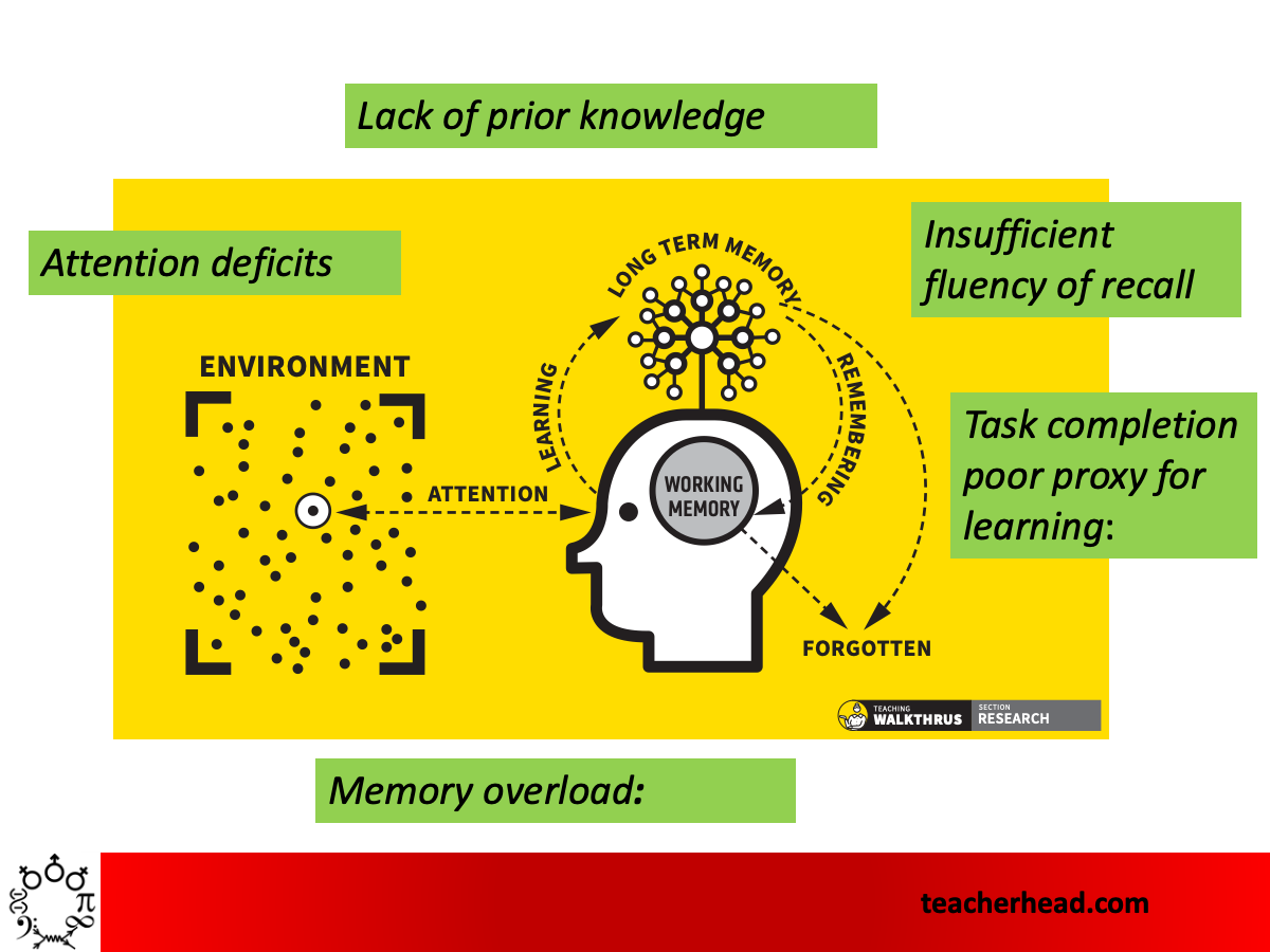 Attention: It’s less about being distracted by external stimuli – the busy wall or a noisy room. It’s more about fighting through the busyness of our thoughts for internal mental attention. The arrow is double headed – because we can direct our attention with effort as well as being open to external stimuli. Focusing attention is a challenge for all of us, not just our students. We then go on to discuss how we have to engineer attention through tasks that involve everyone thinking about the material in hand. Soft accountability – as in the expectations embedded in cold calling or show-me boards – provides an incentive for students to apply the effort needed to direct their attention in the right way for the learning process.