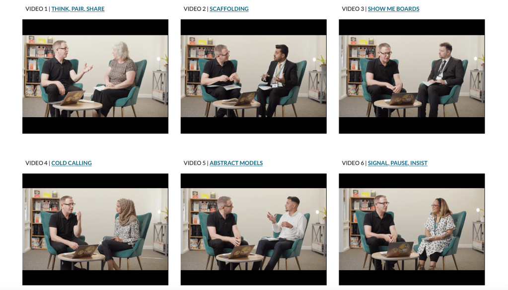 We start by running through the ways in which the teacher enacted the technique really well, with fidelity to each of the steps. We then probe into some of the specific challenges and difficulties what arose in the lesson. Next, I invite the teacher to suggest which of the issues, from all the contenders we’ve explored, might provide a productive focus for them going ahead. We then discuss the implementation of that aspect and agree an imagined timeline for the next coaching cycle. (I felt it was important to do this, even though I”m not actually seeing them again, in order to reinforce the importance of creating iterative cycles for coaching – as a more useful model for anyone watching the videos to inform their coaching practice.)
