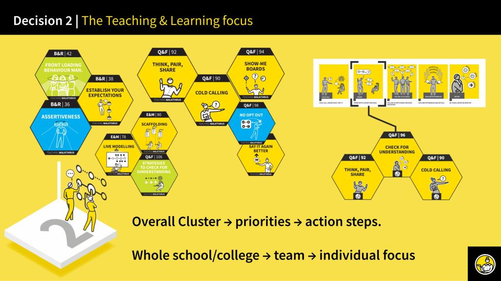 An important part of the process is to construct and communicate a framework that allows everyone to discuss teaching issues with a common language, focusing on the shared problems across the organisation or within each team. This is the main function of the Walkthrus toolkit but, of course, there are alternatives. We’ve designed our materials to help leaders assemble broad overview frameworks and for teams and teachers to make tight clusters of related techniques to focus on – and, underneath the headings, to spell out action steps within each technique. Some organisations engage teachers in shaping the agenda through a consultation process whereas in others leaders are more directive, shaping the agenda based on their quality assurance work or general overview of the common issues.
