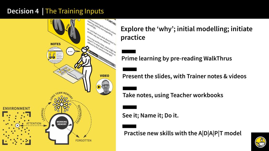 A key part of successful CPD is that teachers have time to build their knowledge of the ‘why’ of teaching practices alongside the ‘how’. This needs a combination of inputs where expertise is shared and technique are modelled and practised, with some degree of social support by working alongside other colleagues. So, in planning a whole programme, we need to know when key CPD inputs will be delivered and how they will match the focus areas identified in Decision 2. There’s no point talking about ‘key focus areas’ and then adding ad hoc bits of training on totally different things.