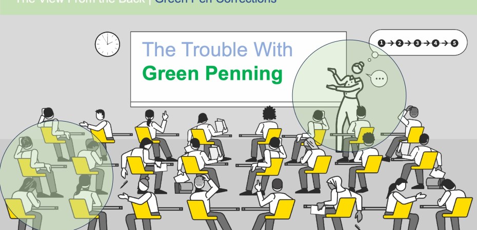 Green penning is not teaching. In my view, from the back, it barely gets close to closing the knowledge gaps. In fact, I’d go as far as to say that it’s less likely to work than to work.