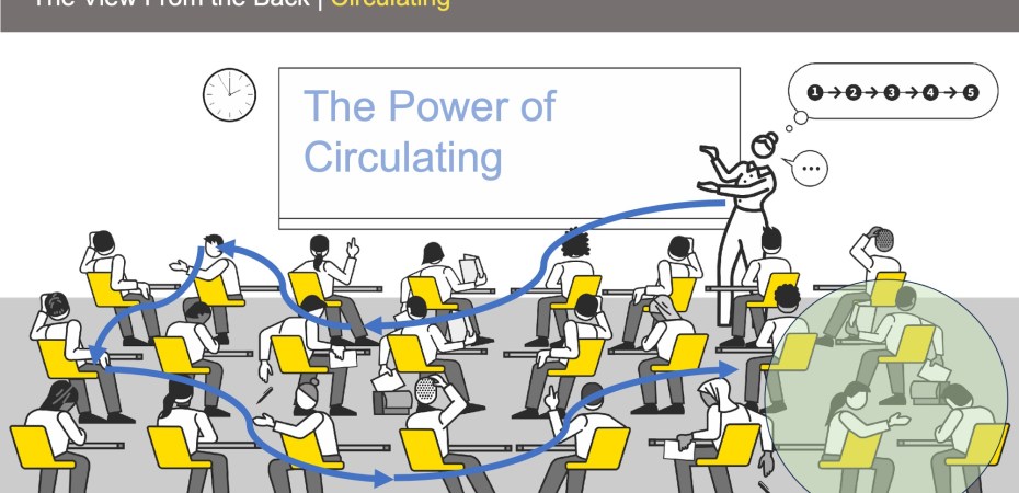 Where teachers circulate, actively and intentionally seeking out the corners, it seems to me that life is much better for students at the back. They are more involved, more included, more motivated and supported and the teacher has better information to respond to, especially during guided practice when students are meant to be heads down, getting on with their individual work.