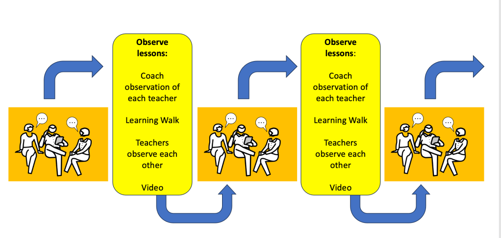 Depersonalisation: When a teacher is sitting one-to-one with a coach it still risks falling into the old rituals and power dynamics of observer/judge vs teacher/recipient. Or it can deviate into a mentoring/personal therapy session! With two people there, you are much more explicitly focused on the technical aspects of the teaching challenge. You frame any perceived weaknesses as common challenges…. there is solidarity in being coached alongside a colleague. Teachers feel less vulnerable. You also immediately get away from any sense of a teacher being singled out for coaching; it’s explicit that this is a process for everyone. Defences come down.