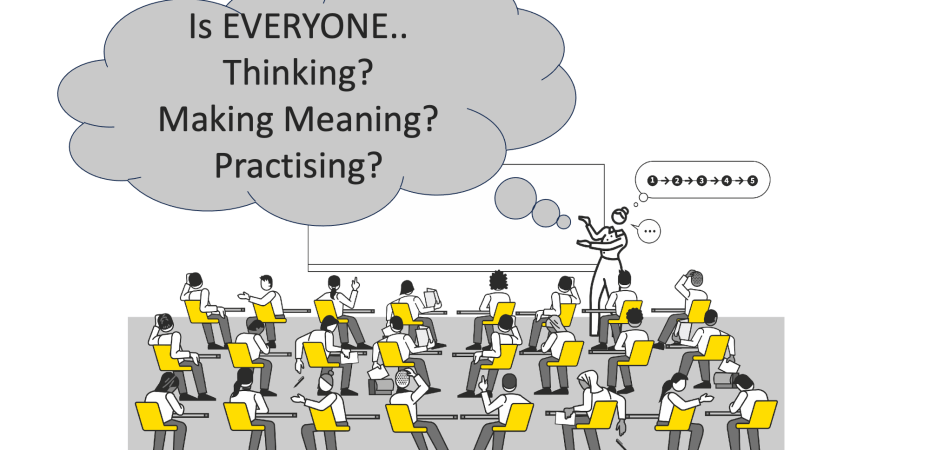 b) a mechanism that allows the teacher to check the ideas that students have formed. This could be a ‘show call’ or whiteboards or pair-share; it could be an appropriate from of retrieval practice. The teacher needs to hear from students what they’ve understood. Multiple responses from a think-pair-share can reveal this as a sample as part of the checking for understanding process, but it’s normally a combination of methods that allow the teacher to get a good read of meaning-making across a class. For sure, unless the teacher is checking, they can’t move the lesson forward responsively.