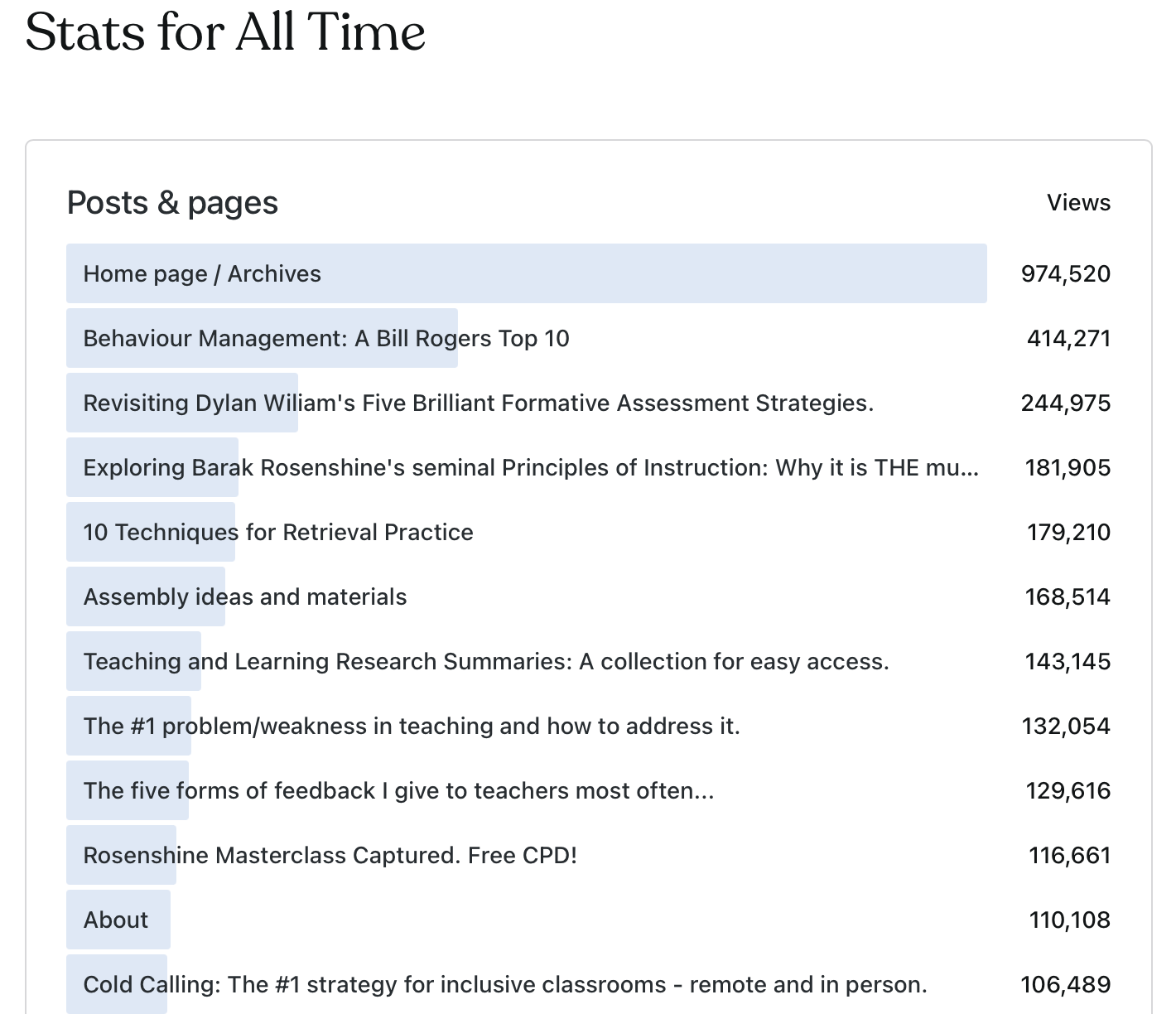 It’s no surprise that my most-read posts are exploring the ideas of three key thinkers: Bill Rogers, Dylan Wiliam and Barak Rosenshine. I’m happy to have been able to play a role sharing their great wisdom. The Bill Rogers post has a life force of its own with over 400K views! Amazing really.