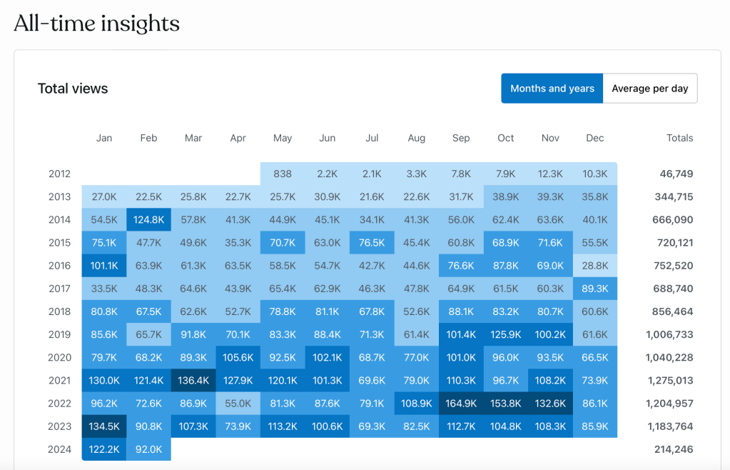 - Volume of output. The stats say I”ve written 834 posts which is an average of about 6 posts a month. More recently this has reduced to about one per week – but with a big total, there’s a lot of material continually accumulating to browse through. Most days I get views for over 100 different posts.