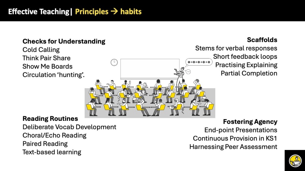 Over the last year or so I’ve seen some fabulous teaching. From Reception to Year 13 and FE settings of many kinds; there’s so much superb teaching to celebrate. This post is an attempt to capture some of details of that. Of course you often find teachers with superb class relationships and great charisma and subject knowledge – but it’s mostly solid everyday practice that interests and impresses me; teachers crafting and blending techniques that systematically involve all students and support every single child to experience success.