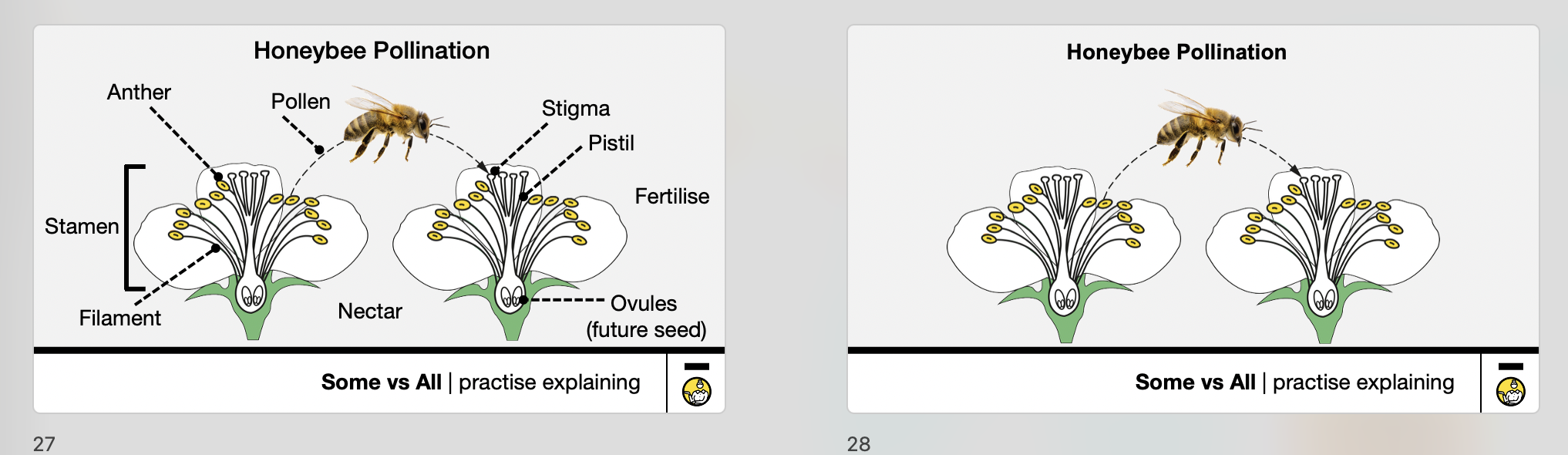 In the absence of a diagram, this is hard to generate from memory if I don’t really remember or understand it. I might say ‘I don’t know’ because I don’t know where to start or which structures to mention. However if I have a labelled diagram I can think about the sequence of events and put them in order, constructing an explanatory narrative using the words presented. Or, to go deeper, I can have an unlabelled diagram, it prompts me to retrieve the relevant terminology to create labels and then I can also construct the explanatory sequence. I have something to think with.