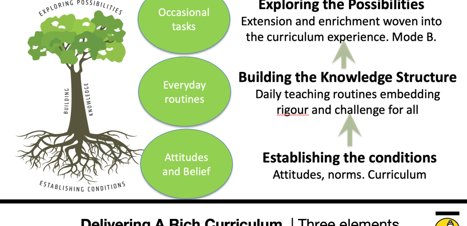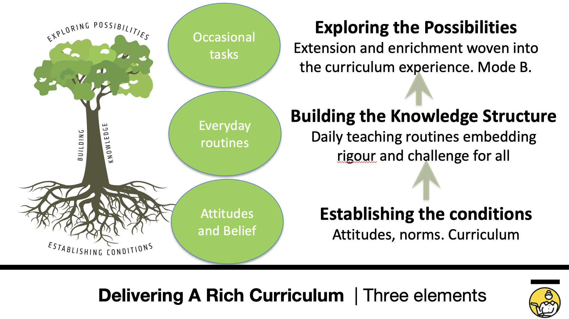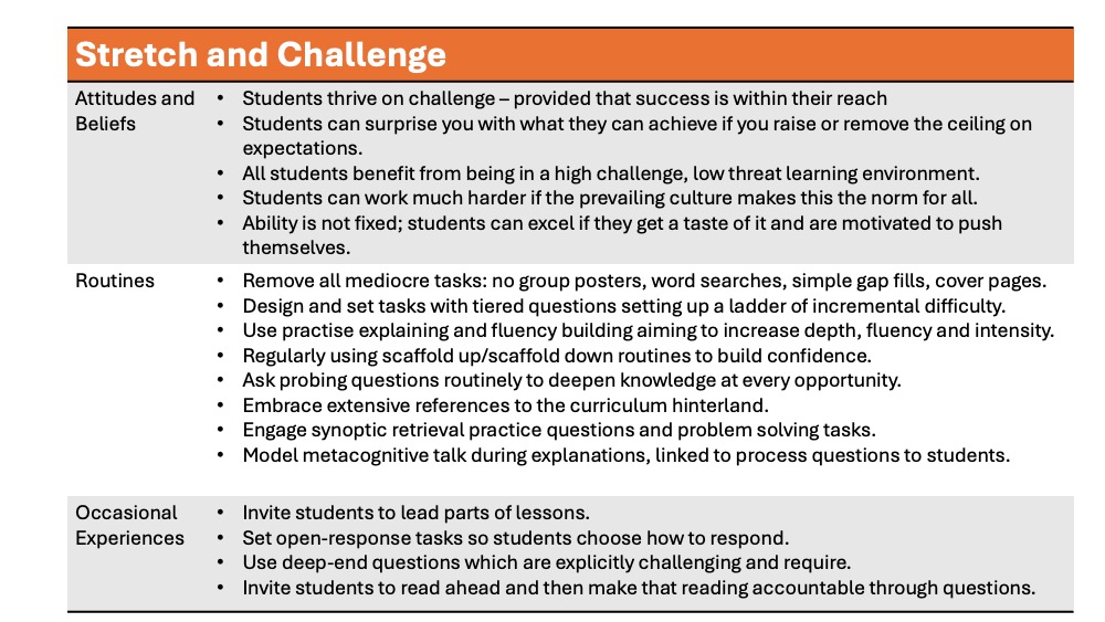 It’s important to explore your attitudes and beliefs from the start; if you don’t think it matters whether all students’ ideas should be explored verbally or that students respond well to reading challenging texts – you’re just not going to engage with it. If you or colleagues think a word search or a group poster with bubble writing are meaningful educational activities, it’s probably necessary to tackle that mindset before you worry about going further with ‘stretch and challenge’. . If the habit is to accept short shallow answers to questions in class, it’s going to be useful to examine why that might constitute low expectations rather than high expectations.