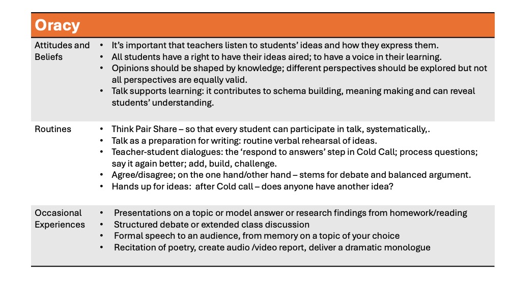 Oracy is comprised of daily routines of classroom practice and a set of experiences that happen over time – there’s no need to scoff that’s it not one or the other or to put people off by putting it on a doe-eyed pedestal of grand thinking that seems like a ton of work and faff that interrupts the flow of instructional teaching.