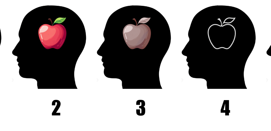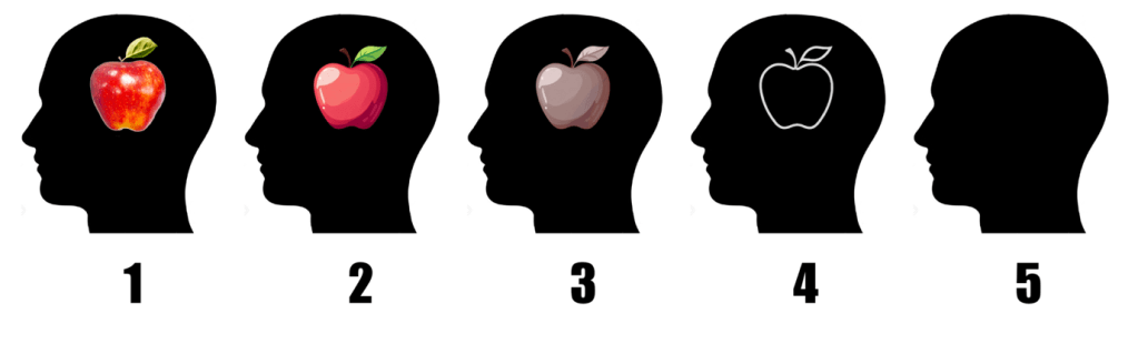 A representation of how people with differing visualization abilities might picture an apple in their mind. The first image is bright and photographic, levels 2 through 4 show increasingly simpler and more faded images, and the last representing complete Aphantasia shows no image at all.