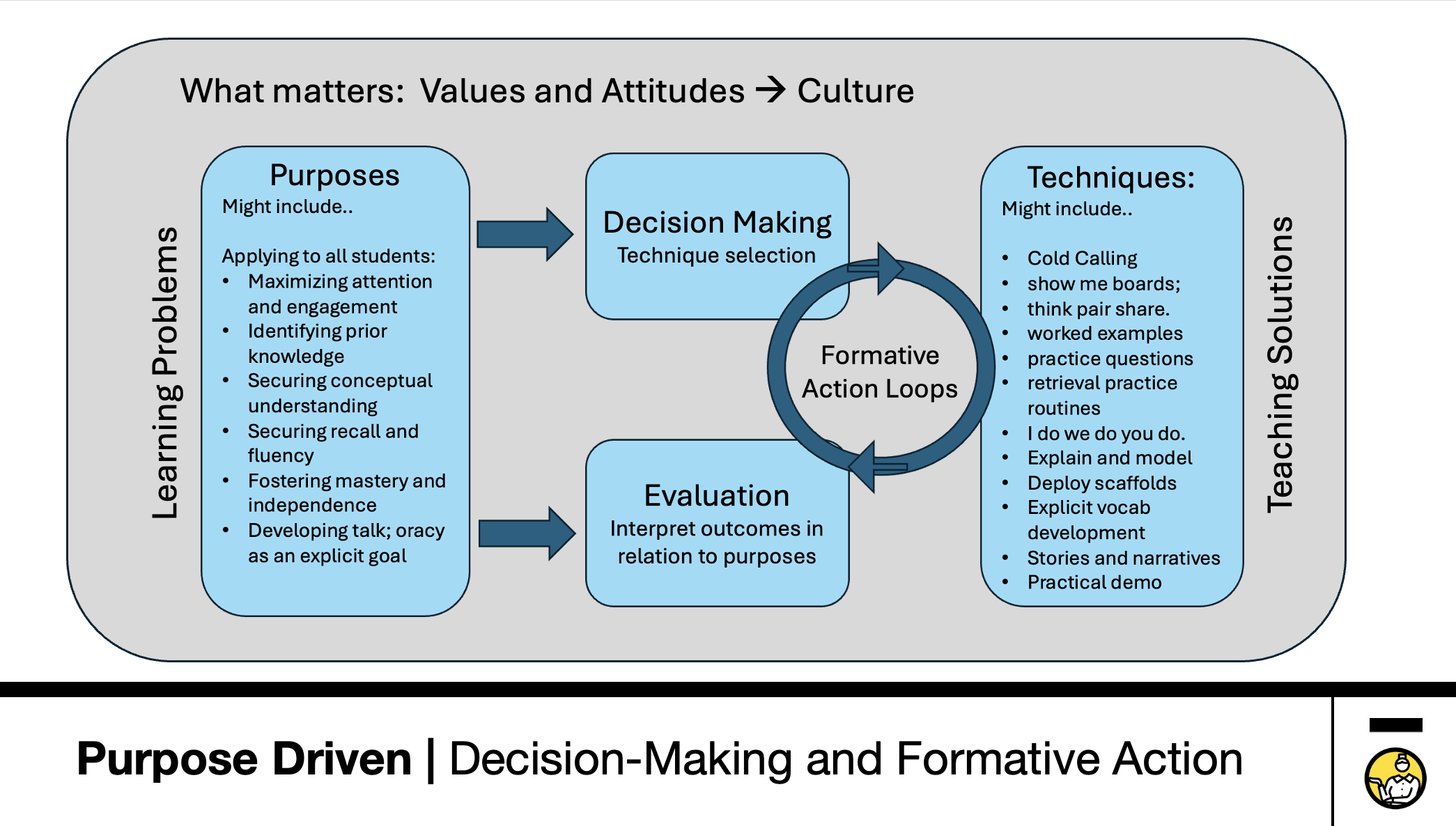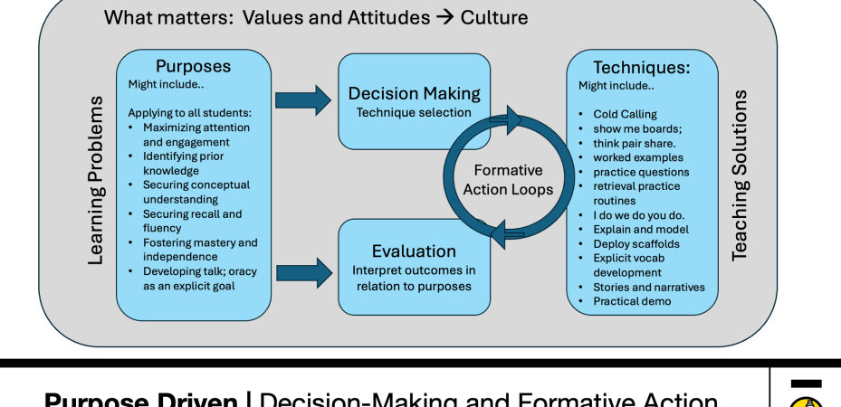 But, you can’t make a good choice between A and B unless you’re clear of the purpose; clear about what you want to do. So you need to start with knowing the purposes. These need to be really well articulated. eg it’s important to secure the understanding of ALL learners, so you need to secure feedback from every single student in order to evaluate whether you’ve been successful. This purpose leads to you selecting a good technique like show-me boards, rather than cold-calling which wouldn’t tell you more than a handful of responses.