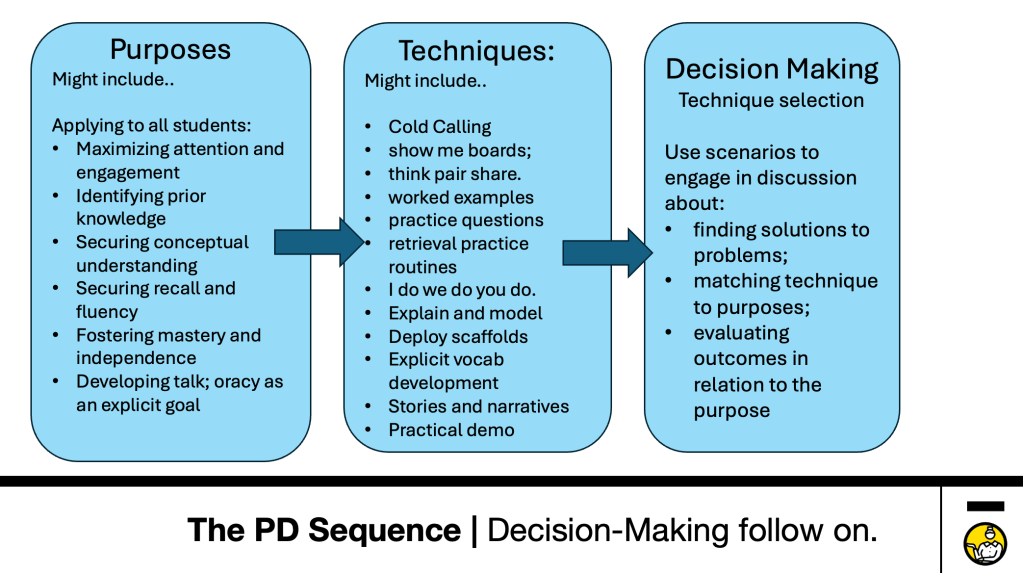 For sure any PD process that leads teacher to doing techniques performatively – that dreaded ‘non-negotiable’ concept, such a curse – without knowing why – is a bad bad process. It absolutely needs to be purpose first, then technique and finally, decision making. And yes, these will all intersect, mutually reinforce and overlap. Life is always more complicated!