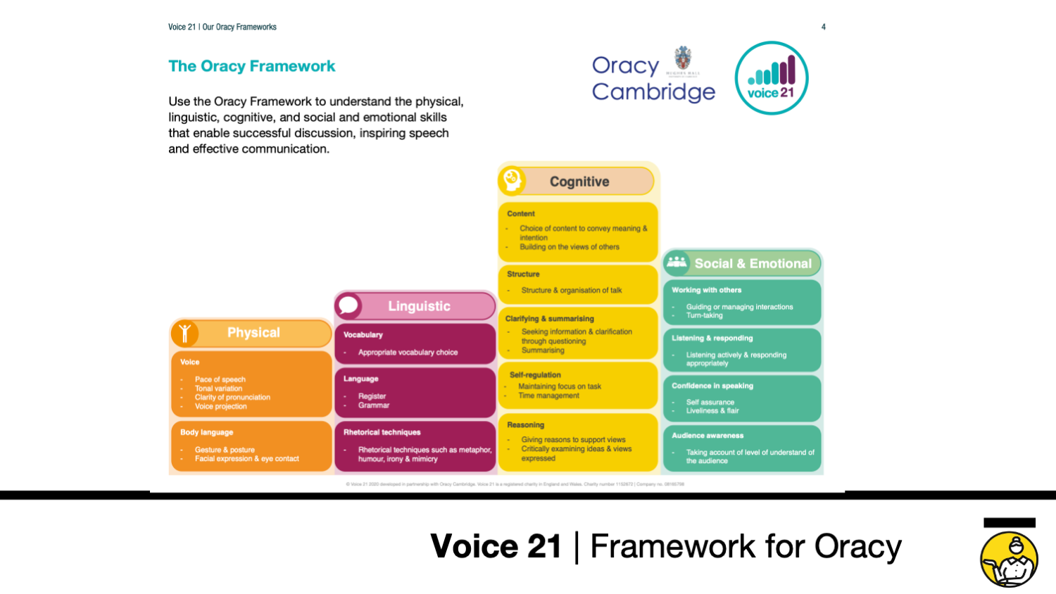 Voice 21 has devised and promotes a number of really useful frameworks that allow teachers to understand oracy through a number of lenses. First is the Oracy Framework.