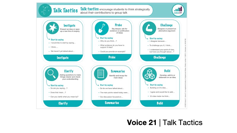 Finally – amongst a lot more content from the course I attended – a big takeaway was the set of Talk Tactics. These are designed to shape students’ contributions to talk – with a parallel set for teachers.