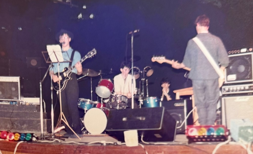 Looking back, we made some fantastic songs, morphing a New Order/Bunnymen-esque sound into something distinctively us!  Our college gigs were the stuff of legend (in our heads), usually featuring Julian playing bass with his back to audience and, on one occasion, with blood trickling down his face after an incident with a falling cymbal.  Rock’n’roll! Jules actually hated playing in front of people – he found it embarrassing – so, not a natural front man, he usually needed quite a good dose of alcoholic encouragement!