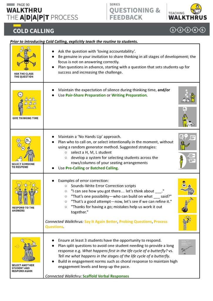 In this article by Kate Jones, referencing Doug Lemov’s work, she writes: Cold calling involves asking students questions, but with a no-hands-up approach. Instead, a teacher asks a question and all students are given time to think and prepare an answer. Then, the teacher can call on any member of the class to respond.