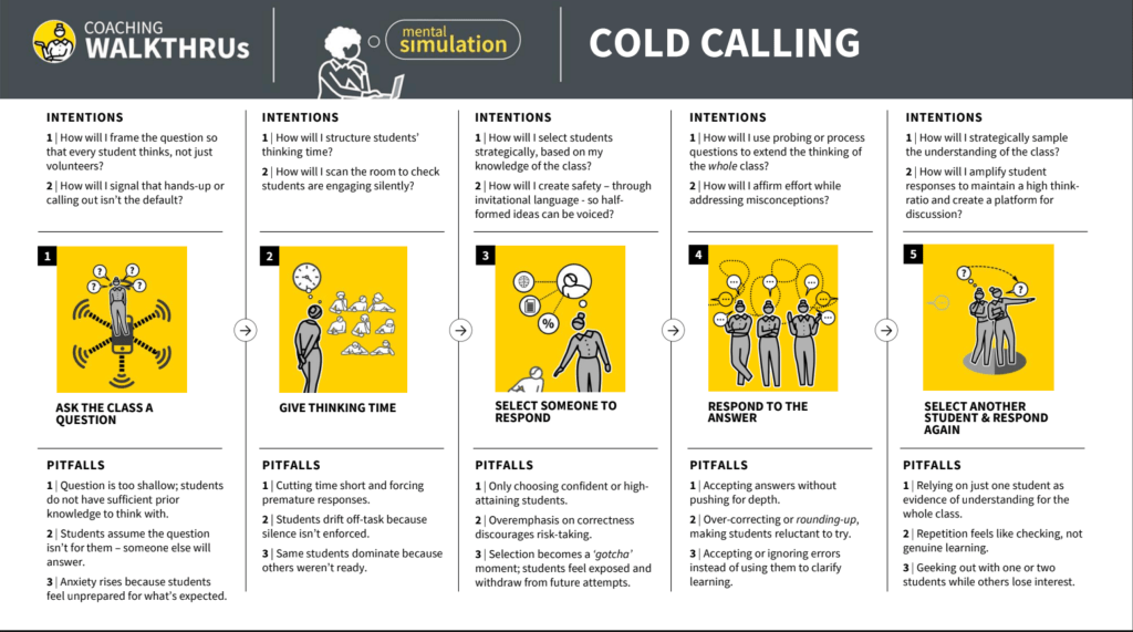 Is that a problem? No – I don’t think so, provided that, in a local context, there’s agreement about what Cold Calling means and is rooted in the same core principle: everyone giving attention and thinking. In schools using WalkThrus we often find those final two steps are the hardest to nail because of ingrained habits – and that’s ok. It’s always something to work on. The key thing is that everyone is asked the question, is engaged, focuses their attention and is ready to be asked the answer. Steps 1-3 are the foundation; 4-5 are a development.