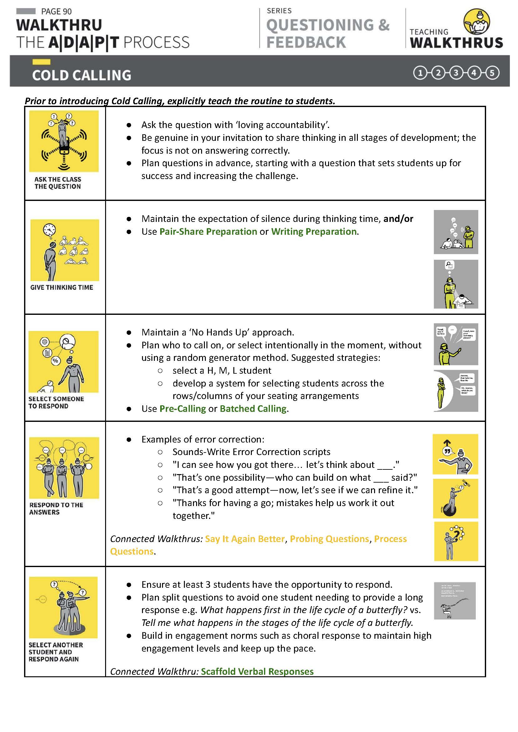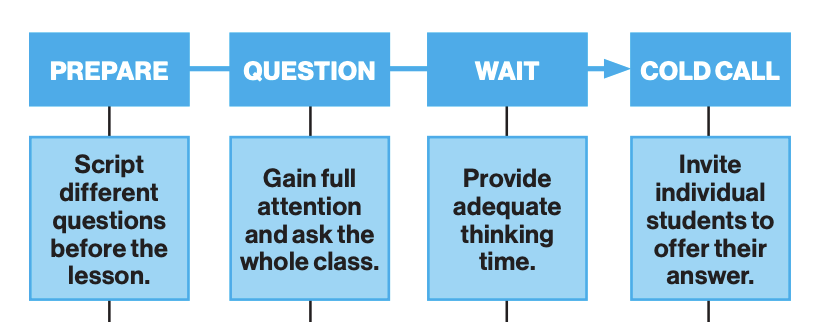 In this article by Kate Jones, referencing Doug Lemov’s work, she writes: Cold calling involves asking students questions, but with a no-hands-up approach. Instead, a teacher asks a question and all students are given time to think and prepare an answer. Then, the teacher can call on any member of the class to respond.